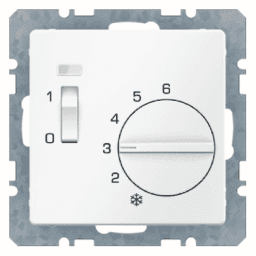 | Raumtemperaturregler mit Öffner, Zentralstück, Wippschalter und LED Berker Q.1/Q.3 polarweiß, samt – mit Aufdruck – Regulierknopf mit Temperaturbereichsbegrenzung – mit Ein-/Ausschalter und Kontroll-LED für Ein – mit thermischer Rückführung – mit separatem Anschluss für Nachtabsenkung – z.B. für Stellantriebe stromlos geschlossen – ohne Spreizkrallen – mit Steckklemmen 5 – 30 °C, 50/60 Hz Nennspannung 250 V~ Schaltstrom 10 A induktive Last bei cos phi 0,6 max. 4 A Schalttemperaturdifferenz ca. 0,5 °C Nachtabsenkung ca. 4°C Neutralleiter erforderlich! Wird die eingestellte Temperatur erreicht, öffnet der Kontakt. | |