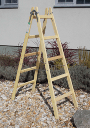 Doppelleiter 5-sprossig, lt. ÖNORM, Sprossenabstand 320mm, Holme 60x23mm, Sprossen 45x23mm, Beschläge komplett verzinkt, 2 Ketten, 2 Versteifungen, die 3. Sprosse von oben besteht aus speziell hartem Material