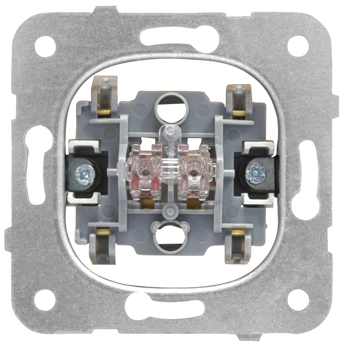 Robuster Schalter-Einsatz mit Metalltragrahmen aus feuerverzinktem Stahl. Bei dem Einsatz ist der Phaseneingang rot markiert und bietet so schnelle Orientierung beim Anschluss. Ausgefräste Nuten zum exakten waagrechten bzw. senkrechten Aneinanderreihen mehrer Schalter-Einsätze.