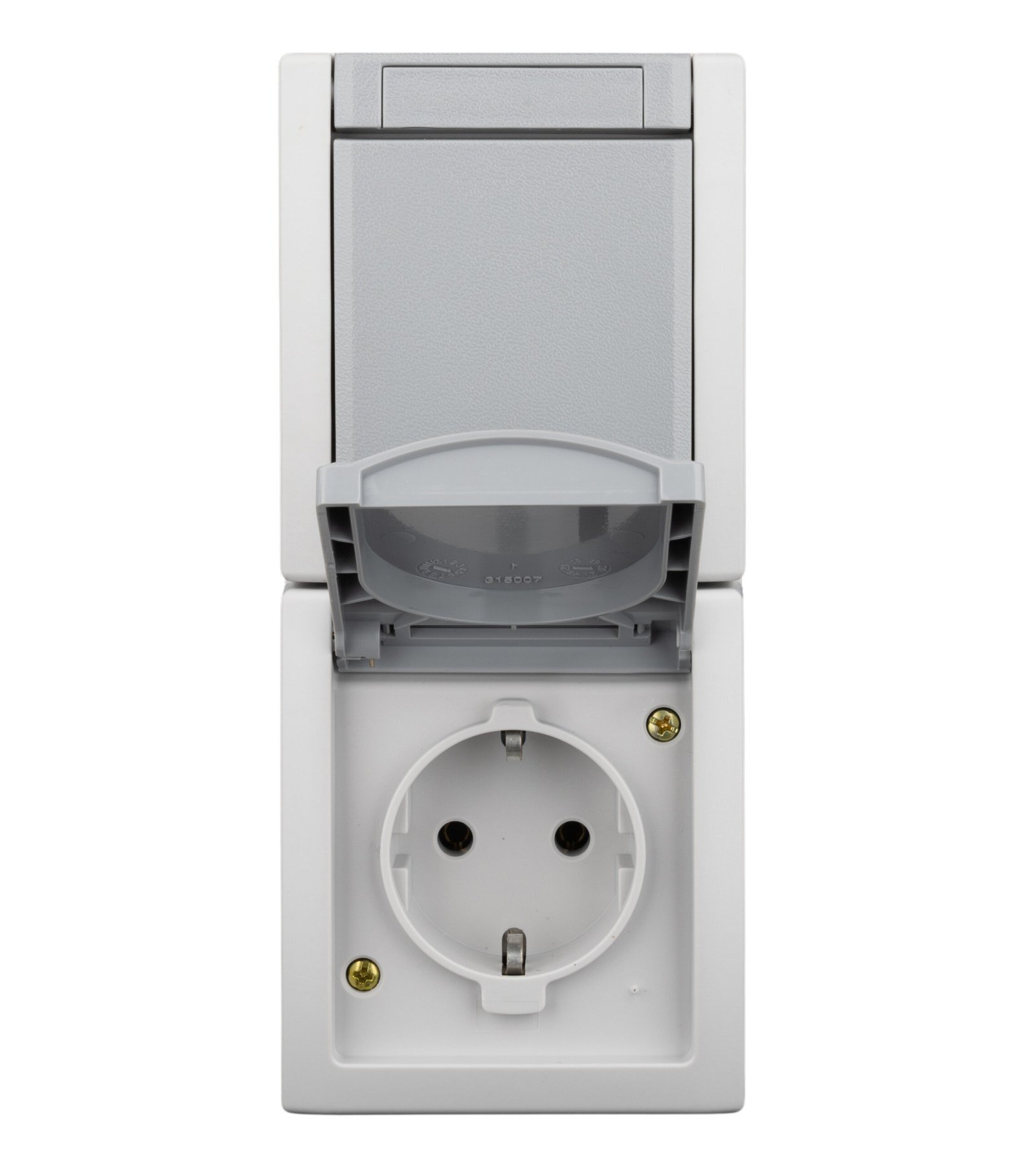 Robuste Aufputz-Schalter-Steckdosen Kombination aus langlebigem und witterungsbeständigem, glasfaserverstärktem Thermoplast-Kunststoff. Schalter und Steckdose sind IP54 Spritzwasser geschützt und bieten auch zusätzlichen Schutz gegen Staub. Weiters sind sie gegenüber Chemikalien und erhöhten Temperaturen resistent und besitzen gleichzeitig eine hohe Schlagfestigkeit (IK05). Innerhalb des Schalters befindet sich für den Erdungsanschluss bereits eine angeschlossene Schnellanschlussklemme, welche ein noch einfacheres Anschließen ermöglicht. Es können bis zu drei Kabeln durch die Dichtungsmembran durchgeführt werden sowohl oberhalb, als auch unterhalb des Schalters.