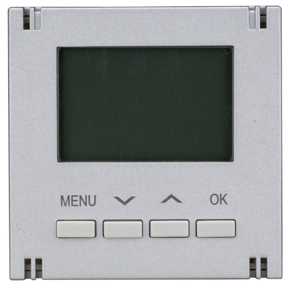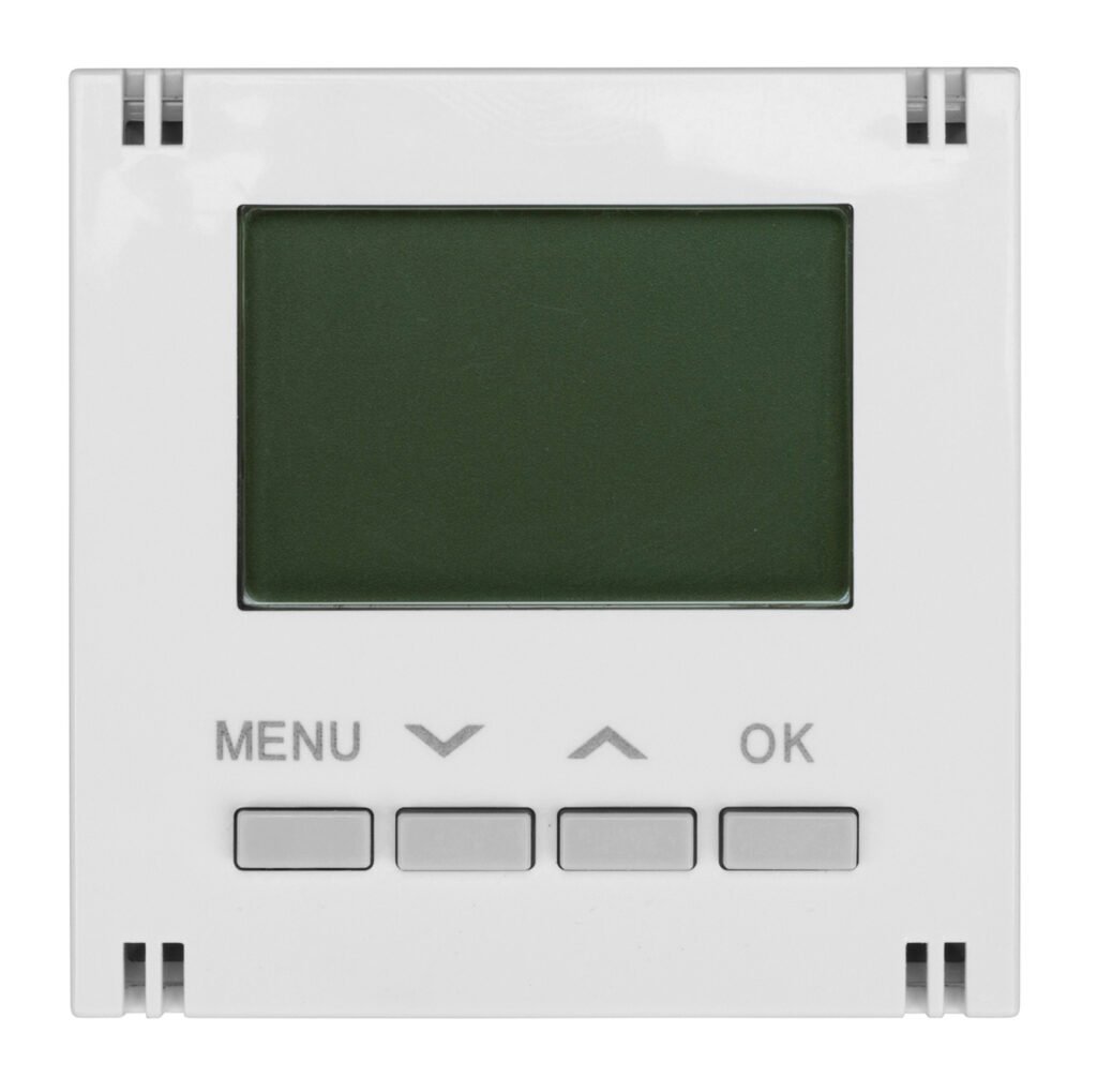 Digitaler Raumthermostat-Aufsatz bestehend aus einem halogenfreiem Kunststoffgehäuse und einem LCD-Display. Geeignet für den elektronischen Raumthermostat-Einsatz EV103010–. Der Raumthermostat verfügt über ein Wochenprogramm für manuelles und zeitprogrammiertes Regeln der Temperatur in geschlossenen und trockenen Räumen. Weiters verfügt der Aufsatz über eine automatische Sommer-/Winterzeitumstellung, drei verschiedenen Betriebsmodi (Standby/Komfort/Nacht). Es können maximal vier Betriebsbereiche pro Tag eingestellt werden. Das Heizgerät kann wahlweise über einen Öffner- oder Schließerkontakt angesteuert werden.