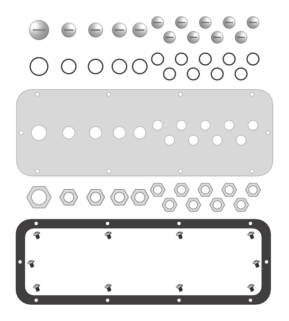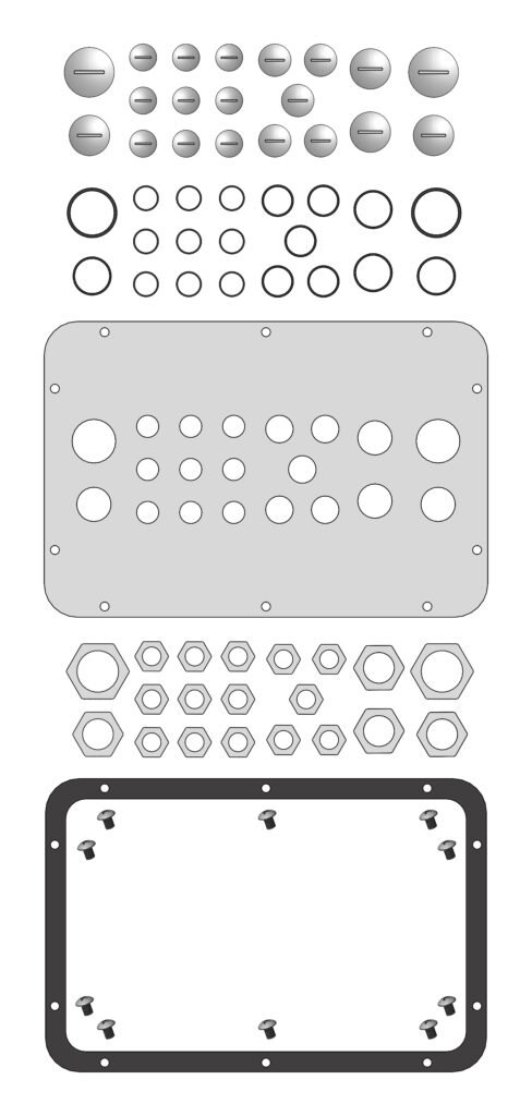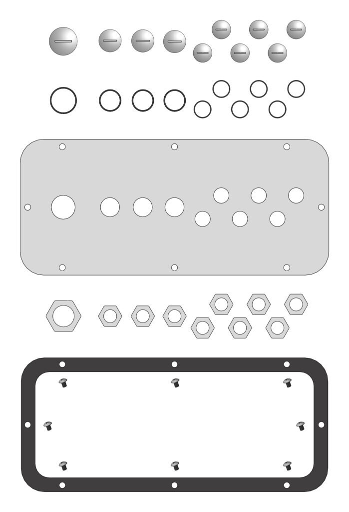Kabeleinführungen 12xM16, 1xM25, 1xM32 inklusive Blindverschraubungen, Flanschausschnitt B=200 T=115mm