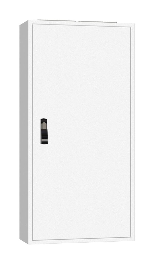 •Aufputz-Verteiler mit Rückwand, standardmäßig mit 3-Punkt-Stangenverschluss mit Schwenkhebel (für Halbzylinder-Einsatz vorbereitet)