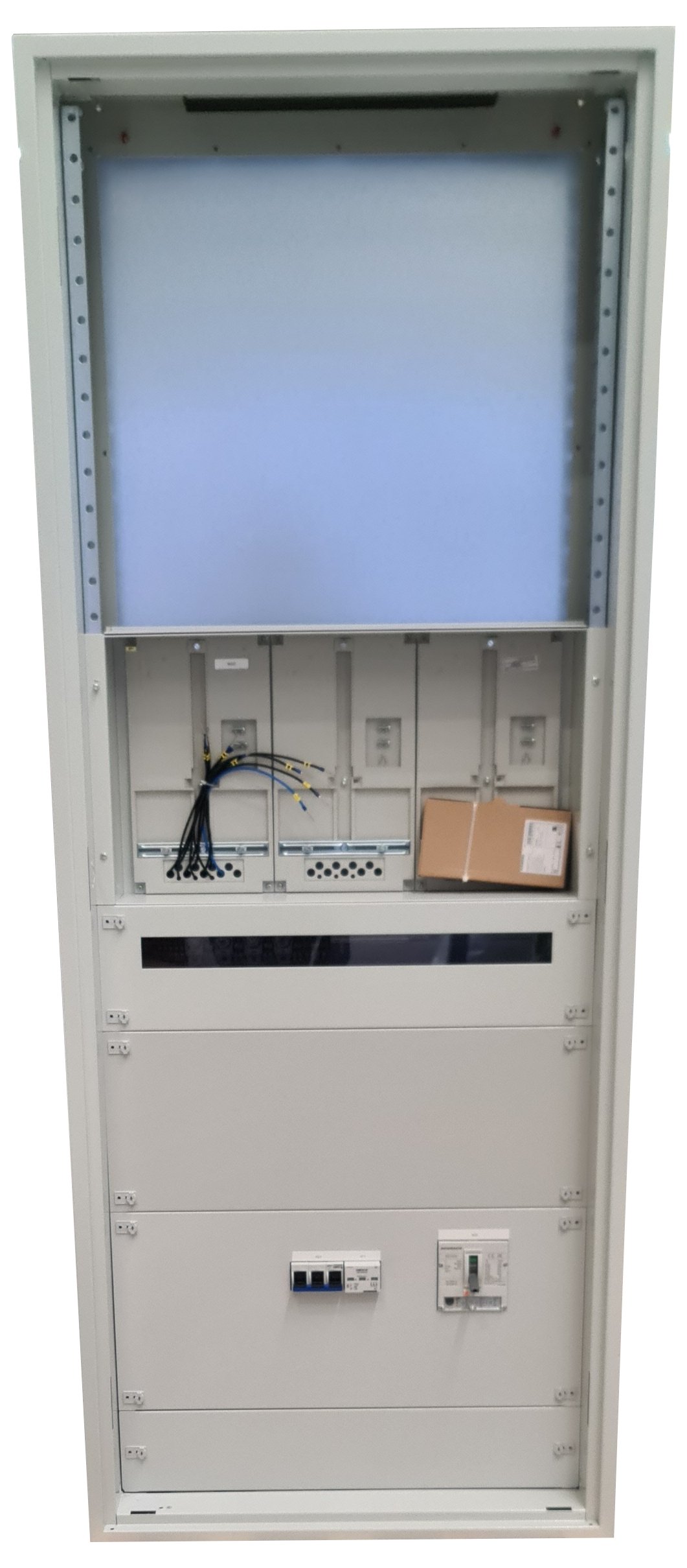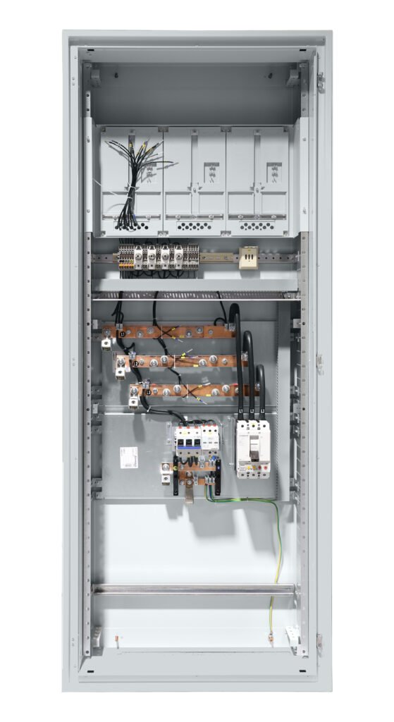 IP20C, Schutzklasse I, Stahlblech, RAL7035 (Lichtgrau), 5-polige Sammelschiene CU inklusive PEN Verbindung, Einspeisung links mittels V-Klemmen, ÜSP 3+0 TNC (B+C), inklusive Wandlerlaschen, Abgang rechts über 3-poligen Leistungsschalter, 3 Zählerplätze, H=2125 B=810 T=300mm
