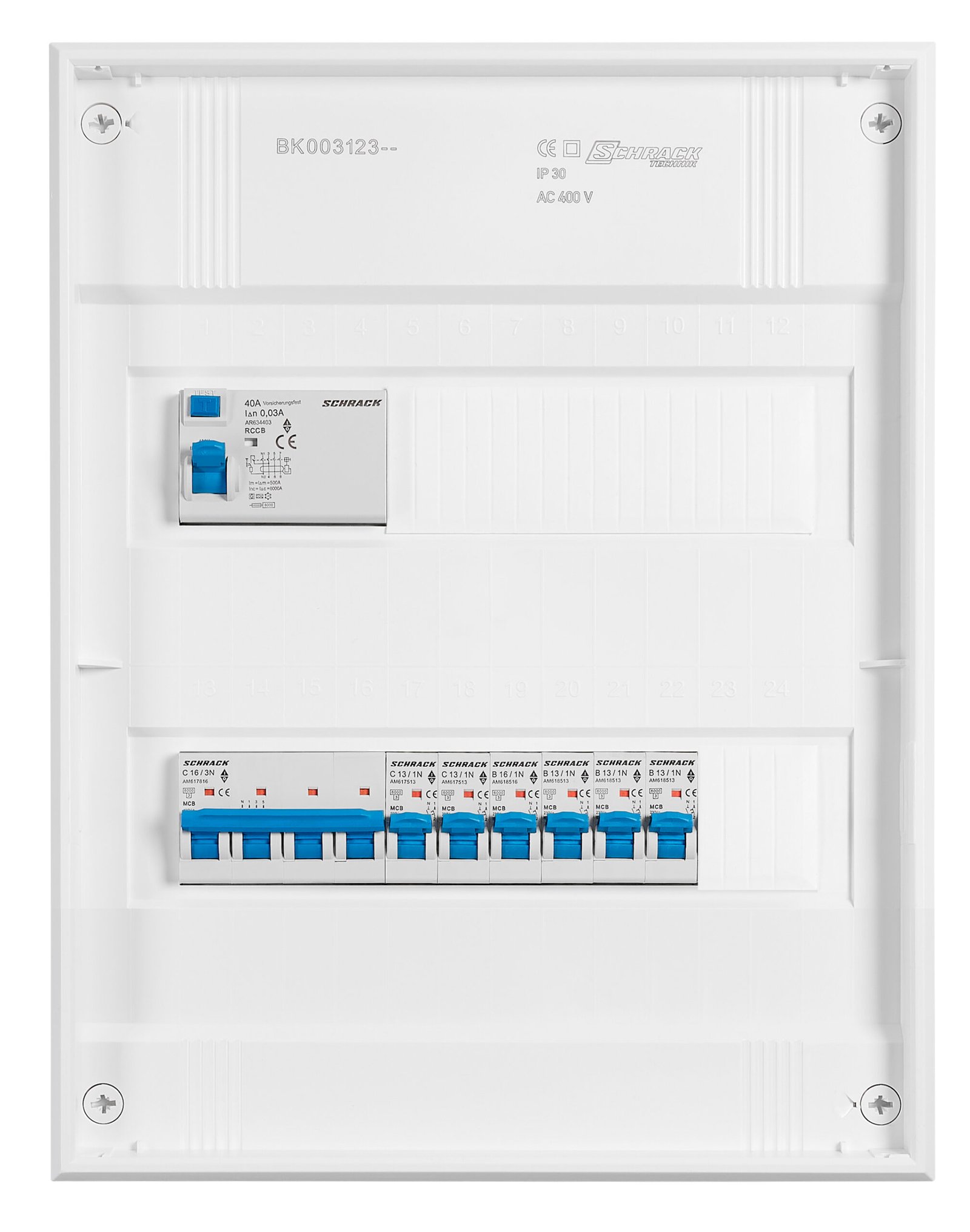 Bestückt und verdrahtet – IP30, Schutzklasse II, 24+4 TE, Vorsicherung max. 40A, RAL9010 Reinweiß 3xB13+3xB16 Projekt Wiener Wohnen, Amparo