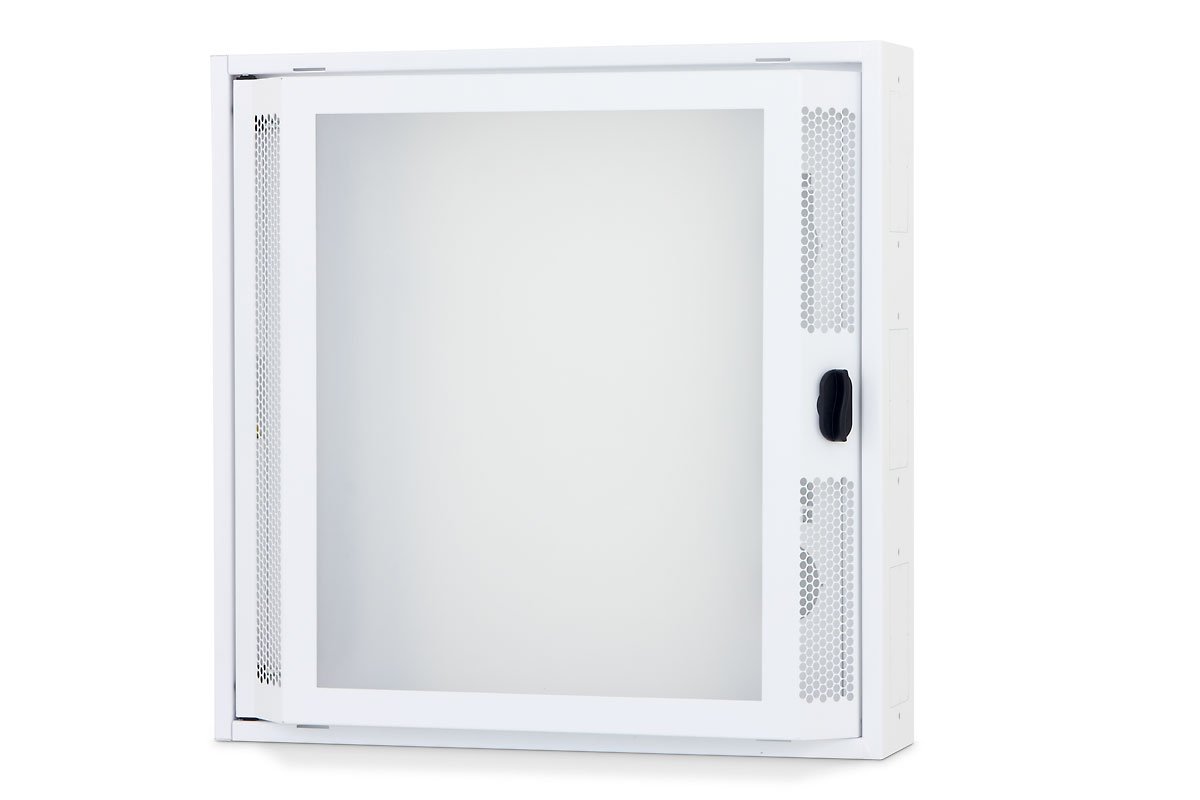 Die nach außen vorgesetzte Tür ermöglicht einen korrekten Biegeradius der angeschlossenen Patchkabel. Die seitliche Perforation der Türe dient der passiven Kühlung der installierten Aktivkomponenten.