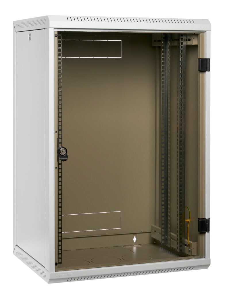 19″- Netzwerkschrank für die Wandmontage. Vornehmliches Einsatzgebiet sind Büros und büroähnliche Umgebungen, wie Wohnungen, Einfamilienhäuser, etc. Als Zentralverteiler in kleineren bis mittleren Netzwerk-Installationen, aber auch für den Einsatz als Etagen- (Unterverteiler) im Horizontalbereich einer strukturierten Verkabelung geeignet. Die abnehmbaren Seitenwände ermöglichen einen bequemen, auch nachträglichen Zugriff auf die installierten Komponenten. Zwecks aktiver Kühlung der Einbauten können optionale Lüfter im Dach und/oder Boden montiert werden.