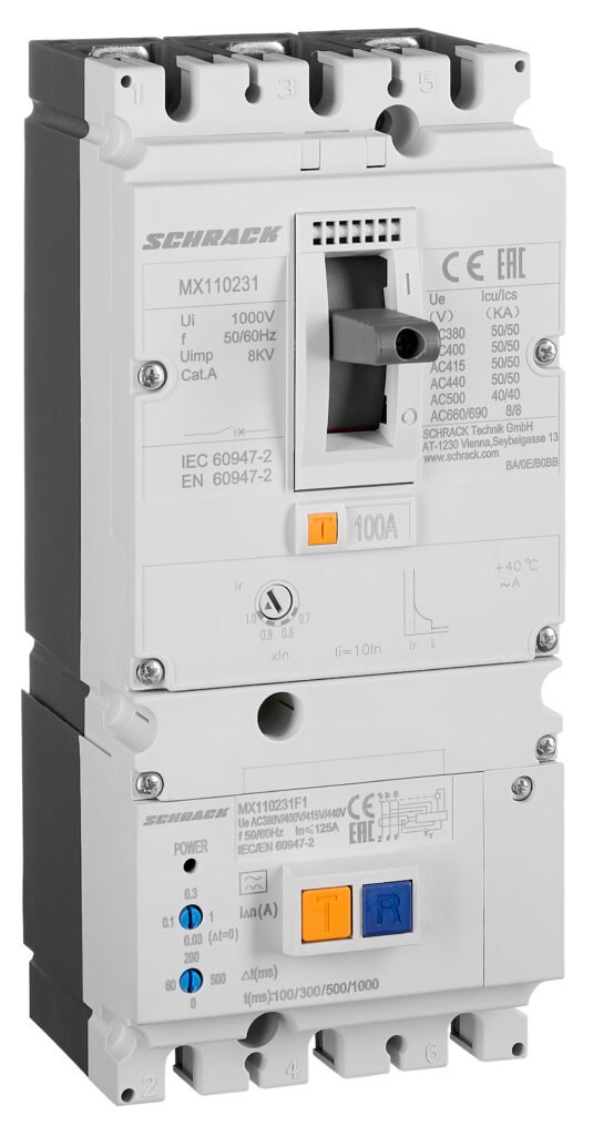 | Auslöseeinheit | Fehlerstromauslöser mit Einstellbereich 0,03A – 0,05A – 0,1A – 0,2A – 0,3A – 0,5A – 1A – 2A |