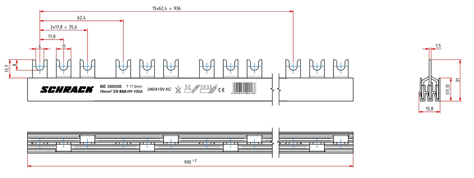 Drehstromschiene, Verschienung, 3polig, 3, polige, Schiene, 3polige, Stromscheine, Verdrahtungsschiene, 3-polig, Phasenschiene