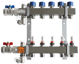 Edelstahl-Verteiler für Flächenheiz- und Kühlsysteme, Verteilerstämme aus Edelstahl, montagefreundliche, flachdichtende Anschlusstechnik, Verteiler mit 1″ Außengewinde für Systemanschluss wahlweise rechts / links, Entleerungs- und Entlüftungsarmatur in den Verteilerstämmen integriert. Bestehend aus: – Vorlaufverteiler DN 25 mit integrierten, absperrbaren Durchflussanzeigern 0,1 – 5 l/min – Rücklaufsammler DN 25 mit integrierten, absperrbaren Feinventilen für Heizmittelstromeinstellung, Handrad-Schutzkappe und Adaptergewinde für Stellantriebmontage – Kugelhähne sind nicht enthalten und müssen separat bestellt werden – Klemmverbinder 3/4″ für Heizrohranschlüsse müssen separat bestellt werden. – Die Konsolen für die Verteiler sind in den Verteilerschränken bereits montagefertig enthalten – Bei Wandmontage sind die Konsolen separat zu bestellen.