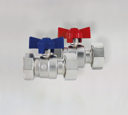 2 Kugelhähne mit Flügelgriff rot/blau, MS vernickelt, Überwurfmutter 1″ x 1″ IG, Länge 58 mm