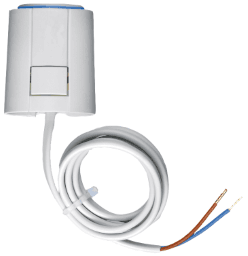 M 30 x 1,5. Schließkraft 100 N, zur Ansteuerung der Ventile am Heizkreisverteiler mittels 2-Punkt-Signal, werkzeugfreie Steckmontage durch Adapterring, stromlos geschlossen – bei Auslieferung jedoch offen zur einfacheren Montage und Inbetriebnahme, Schutzart IP 54 in allen Einbaulagen, Stellweg 4 mm