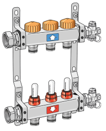 Edelstahl Vor- und Rücklaufbalken mit steckbaren Heizkreisabgängen, mit Entlüftung und Entleerung am Verteilerende, Anschlüsse mit eingeschraubter Überwurfmutter 1″ flach dichtend. Automatische Durchflussregelung und hydraulischer Abgleich der einzelnen RL-Ventile passend für KM596 KELOX-Thermikmotor, VL-Wassermengenmesser von 0,5-5,0 l/min einstellbar, inkl. schallgedämmten Stahlkonsolen Einsatzbereich: tmax. 70°C/6 bar ACHTUNG OHNE KMP552 PROTEC Schnellsteckkupplung!