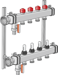 KE KELIT KU590W ULTRA Industrieflächenverteiler Edelstahl 6 Heizkreise 3/4″E, 6/4″ Balken, Thermostatventil im VL, Wassermengenm. im RL