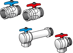 Anschlusskugelhähne in gerader oder Winkelform für die Absperrung der Verteiler, flach dichtendem AG zum Verteilerbalken inkl. Dichtung, (RL-Winkelform verlängert) Messing porenfrei metallisiert
