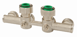 Hahnblock aus Messing vernickelt mit 3-Wege-Kugel zur verzweigungslosen Verlegung im Fußboden oder zum Anschluss weiterer Heizflächen. Absperrung mit Stellungsanzeige, ohne Anschlag, für den Anschluss mit Klemmverschraubungen, 50 mm Achsabstand, Konusteile für Ventil-Kompaktheizkörper mit G 3/4 a Hahnblock-Anschluss.