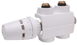 Durchgangsform, für Heizkörper mit integriertem voreinstellbarem Regelventil für Zweirohrbetrieb, inkl. Anschlussstück und Dichtung, matt vernickelt, absperrbar mit Anschlussmöglichkeit für Entleerungs- und Füllarmatur, inkl. thermostatisches Fühlerelement mit Schnappbefestigung und höchster Regelgenauigkeit (CA0,2 K) gemäss DIN EN 215 und Kunststoffabdeckung, eckig