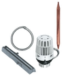 HEIMEIER Thermostat-Kopf mit Anlege bzw. Tauchfühler, Skalenhaube weiß RAL 9016, Flüssigkeitsgefüllter Fühler mit 2 m Kapillarrohr, für alle Heimeier Thermostatventilunterteile, verdeckte obere und untere Begrenzung des Temperaturbereiches oder Blockierung einer Einstellung durch Anschlagclips, Einsatz des Fühlers in Verbindung mit einem Wärmeleitsockel als Anlegefühler oder mit einer Tauchhülse als Tauchfühler, Sollwertbereich 20 bis 50°C. Max. Fühlertemperatur 60°C, mit Wärmeleitsockel und Spiralfeder, Merkzahl 20-30-40-50. Fabrikat: IMI Heimeier Typ: K Art.-Nr. 6402-00.500