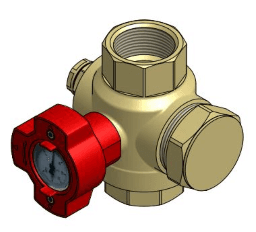 mit verdrehbarem Thermometer 0-120 °C, 4 Abgängen und drei Kugelbohrungen, Kugel mit T-Bohrung, Kugel mit und gegen den Uhrzeigersinn um 360 °C verdrehbar, mit Verschlüssen für Funktionsöffnungen