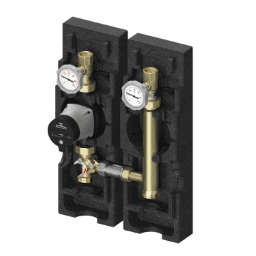 Verteiler-Pumpengruppe V-MK DN 25 (Mischerkreis für Verteileraufbau) komplett ohne Umwälzpumpe (EL 180 mm) zwei 2-W.-Kugelhähne (rücklaufseitig mit handaufstellbarer Schwerkraftbremse), 2 im Kugelhahngriff integrierte Kontaktthermometer (Anzeigebereich 0-120 Grad C), ein 3-Wege-T-Mischer inkl. Stufenlos einstellbaren Bypass, EPS-Isolierung, Achsabstand ab 200mm (größer 250 mm mit Mehrpreis erhältlich), unterer Abgang 1 1/2″ AG flachdichtend, oberer Abgang Innengewinde 1″ Kvs-Wert der Gruppe: 6,2 Ausführung: ohne Pumpe