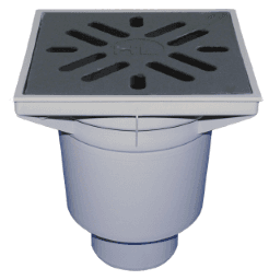 HL606/1 Perfekt-Ablauf DN110 senkrecht mit Kunststoffrahmen 244 x 244 mm, Guss-Einlaufrost 226 x 226 mm, Sandfang und frost- und austrocknungssicherer Geruchssperre