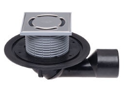 HL80 Balkon- und Terrassenablauf DN50/75 mit Dichtflansch, von waagrecht bis senkrecht stufenlos drehbarem Abgang, frost- und austrocknungssicherem Geruchssperreinsatz, ablängbarem Aufsatzrahmen 12 – 70 mm / 123 x 123 mm und Einlaufrost Edelstahl 115 x 115 mm sowie Baustützrahmen. Bauschutz im Lieferumfang enthalten.