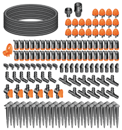 Einsatzbereites Tropfbewässerungs-Kit für für die Bewässerung von bis zu 60 Pflanzen im häuslichen Gemüsegarten. Inklusive aller benötigten Anschlüsse für die Realisierung von 6 Bewässerungszonen. Die Wassermenge kann für jede Pflanze nach ihren Bedürfnissen eingestellt werden. Das Set ist nach Belieben erweiterbar. Set bestehend aus: – 1 x 25 m Verteilerrohr 1/2″ – 1 x Hahnstück 3/4″ (CL86270000) – 1 x Schnellkupplung für Hahnstück und Verteilerrohr 1/2″ (CL910090000) – 6 x Verbinder mit Absperrventil für Verteilerrohre 1/2″ (CL912800000) – 7 x Winkelstück-Verbinder für Verteilerrohre 1/2″ (CL910810000) – 11 x T-Verbindungen für Verteilerrohre 1/2″ (CL910710000) – 12 x Endstopfen für Verteilerrohr 1/2″ (CL910860000) – 35 x Erdspieße für Verteilerrohr (CL910900000) – 1 x Lochstanze für Verteilerrohr u. Schraubschlüssel für Sprühdüsen (CL911850000) – 10 x Stopfen für Tropfrohr 1/4″ und Verteilerrohröffnungen (CL911700000) – 40 x Endtropfer 0-10 l/h Plus (CL912140000) – 20 x Kleinflächendüsen (CL912320000)