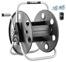 transportable Schlauchtrommel vollständig aus Metall gefertigt und mit Epoxidharzbeschichtung als Schutz vor Witterung und Alterung zur Bodenaufstellung oder zur Wandaufhängung Montage ohne Werkzeug Schlauchkapazität: 85 m 1/2″ oder 40 m 3/4″ inklusive 2 x Wandbügel und 1 x Schlauchstück mit Schnellkupplung 1/2″