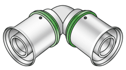 Press-Winkel 90° für Richtungsänderung mit minimalem Radius, aus entzinkungsbeständigen Messing (DZR) porenfrei metallisiert, inkl. Stützhülsen mit O-Ringen und Edelstahl-Presshülse „unverpresst undicht“