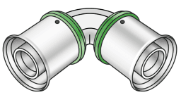 Zeta-Wert optimierter Press-Bogen 90° für Richtungsänderung mit minimalem Radius, aus entzinkungsbeständigen Messing (DZR) porenfrei metallisiert, inkl. Stützhülsen mit O-Ringen und Edelstahl-Presshülse „unverpresst undicht“