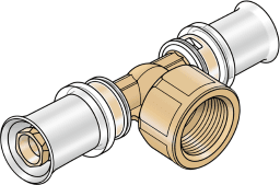 Zeta-Wert optimiertes Press-T-Stück mit Abgang IG, aus entzinkungsbeständigen Messing (DZR), inkl. Stützhülsen mit O-Ringen und Edelstahl-Presshülsen, „unverpresst undicht“, akustisches Leckage-Signal bei Luftdruckprobe KEINE Gewinderohre und Tempergussfittings eindrehen!