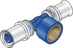 Zeta-Wert optimiertes Press-T-Stück mit Abgang IG, aus PPSU, inkl. Stützhülsen mit O-Ringen und Edelstahl-Presshülsen, „unverpresst undicht“, akustisches Leckage-Signal bei Luftdruckprobe KEINE Gewinderohre und Tempergussfittings eindrehen! KEINE Flüssigdichtmittel oder Dichtfäden verwenden!