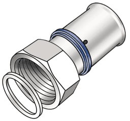Press-Verschraubung mit IG zum Anschluss an Armaturen, z.B. Filter, Verteiler, Pumpen,….. aus Messing porenfrei metallisiert, inkl. Stützhülsen mit O-Ringen und Stahl bzw. Edelstahl-Presshülsen, „unverpresst undicht“, flach dichtend inkl. Dichtung
