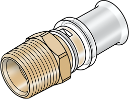 Zeta-Wert optimierter Press-Übergang mit AG zum Eindichten, aus entzinkungsbeständigen Messing (DZR), inkl. Stützhülsen mit O-Ringen und Edelstahl-Presshülsen, „unverpresst undicht“, akustisches Leckage-Signal bei Luftdruckprobe