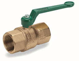 DIN-DVGW zertifizierter Kugelhahn zum Absperren von mediumführenden Rohrleitungen für Trinkwasser nach DIN 13828, Temperatur: max. 100° C, Gewinde nach ISO 7 in den Dimensionen 1/2″ bis 2″, Druck PN10, voller Durchgang, mit 2 O-Ringen und ausblassicherer Spindel mit verchromter Kugel, Kugeldichtungen aus PTFE, Gehäuse aus Pressmessing roh, grüner Aluminium Griff