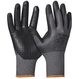 EIGENSCHAFTEN nahtloser dünner Schnittschutzhandschuh mit dichter ¾ Nitril Beschichtung und zusätzlicher Nitril Sandy Beschichtung für rutschfesten Griff extrem leichter und weicher Träger aus fortschrittlichen 18 Gauge Synthetik und Edelstahlfasern, sowie rePET Fasern sehr robuste, atmungsaktive und ölabweisendeBeschichtung optimale Fingerfertigkeit und ein sicherer Griff auch bei glatten Gegenständen gezielt positionierte Verstärkung im Daumen Zeigefinger Bereich für längere Haltbarkeit präzise & schnelle Bedienung von Touchscreens dermatologisch getestet auf HautverträglichkeitANWENDUNGSBEREICHLuft und Raumfahrt, Automobilbau, Maschinenbau, Metallverarbeitung, Glasverarbeitung, Bauindustrie, Landwirtschaft, SanitärbauPRIMÄRER SCHUTZSchützt vor/gegen: Schmutz Mechanische Risiken gem. EN 388 Leistungsstufen