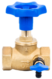 mit Entleerung, Messing-Ventil nach EN 1213, Durchlaufventil mit Innengewinde x Innengewinde, 3D-Oberteil mit steigender Spindel, Dauergeschmiert durch Fettkammer-Konstruktion, Totraumfrei sowohl im offenen als auch geschlossenen Zustand, blaues Handrad mit integrierter Schutzhülse gegen Verschmutzung der Spindel, robuste Wandstärke, hohe Durchflussleistung, um 360° drehbares Entleerungsventil und Entleerungsschraube, Verpackung und verpackt entsprechend ÖNORM EN 1074-1:2000, produziert in Anlehnung an HACCP-Hygienestandard, ÖVGW – geprüft. Technische Daten: Nenndruck: 10 bar, Temperaturbeständigkeit: max. 1h bei 85°C, Durchflussklasse: VA, Einsatzmedium: Trinkwasser