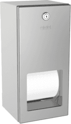 WC-Doppelrollenhalter mit Spindelsystem, für Aufputzmontage, Chromnickelstahl, Oberfläche seidenmatt, Materialstärke 0,8 mm, geschlossenes Gehäuse mit gekanteter Front, Zylinderschloss mit KWC Einheitsschlüssel, für zwei Rollen bis maximal 120 mm (D), Reserverolle fällt nach Verbrauch der ersten Rolle automatisch in Spenderposition, Reserverolle nicht sichtbar, inklusive Edelstahlschrauben und Dübel.Abmessungen 144 x 301 x 138 mm (B x H x T)