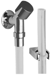 mit Eckabsperrventil, weißem Schlauch, Schlauchlänge 1,50 m, für Wandaufbau Bestehend aus: – 1 Eckabsperrventil mit Keramikoberteil und Designgriff, komplett aus Messing, verchromt – 1 Spezialschlauch für Kneipp’sche Güsse, Farbe weiß, 1,5 m, Anschlussarmatur verchromt mit integriertem Rückschlagventil – 1 Schlauchhalter Kunststoff, verchromt – Betriebsdruck max.: 6,0 bar