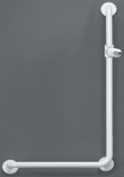 aus korrosionsbeständigem Epoxydharz, pulverbeschichtetem Aluminiumrohr Ø 32 mm mit ergonomisch geformter Polyamidgriffleiste, inklusive verdeckter Zentralbefestigung sowie Inoxschrauben und Polyamiddübel, mit weißem Brausehalter, höhenverstellbar mit ergonomischer Fixierung und drehbar für Handbrause. Belastbarkeit bis 150 kg, weiß