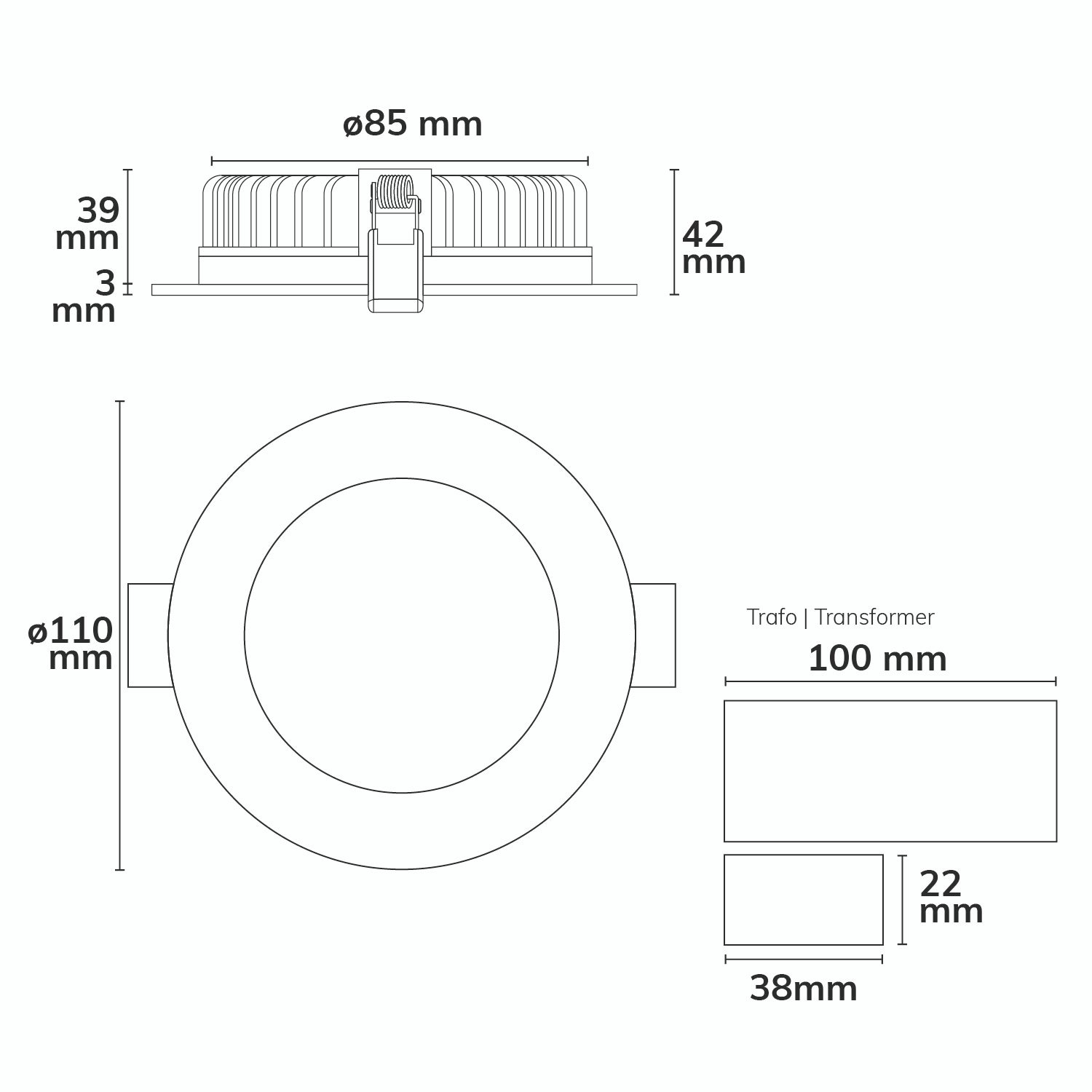 Dimmrange: 20-100% der Lichtleistung mit TRIAC Dimmer | Empfehlung: Phasenabschnitt-Dimmaktor verwenden | Flickeranteil abhängig vom eingesetzten Dimm-Aktor und der Dimm-Art | Flickerfree im ungedimmten Zustand