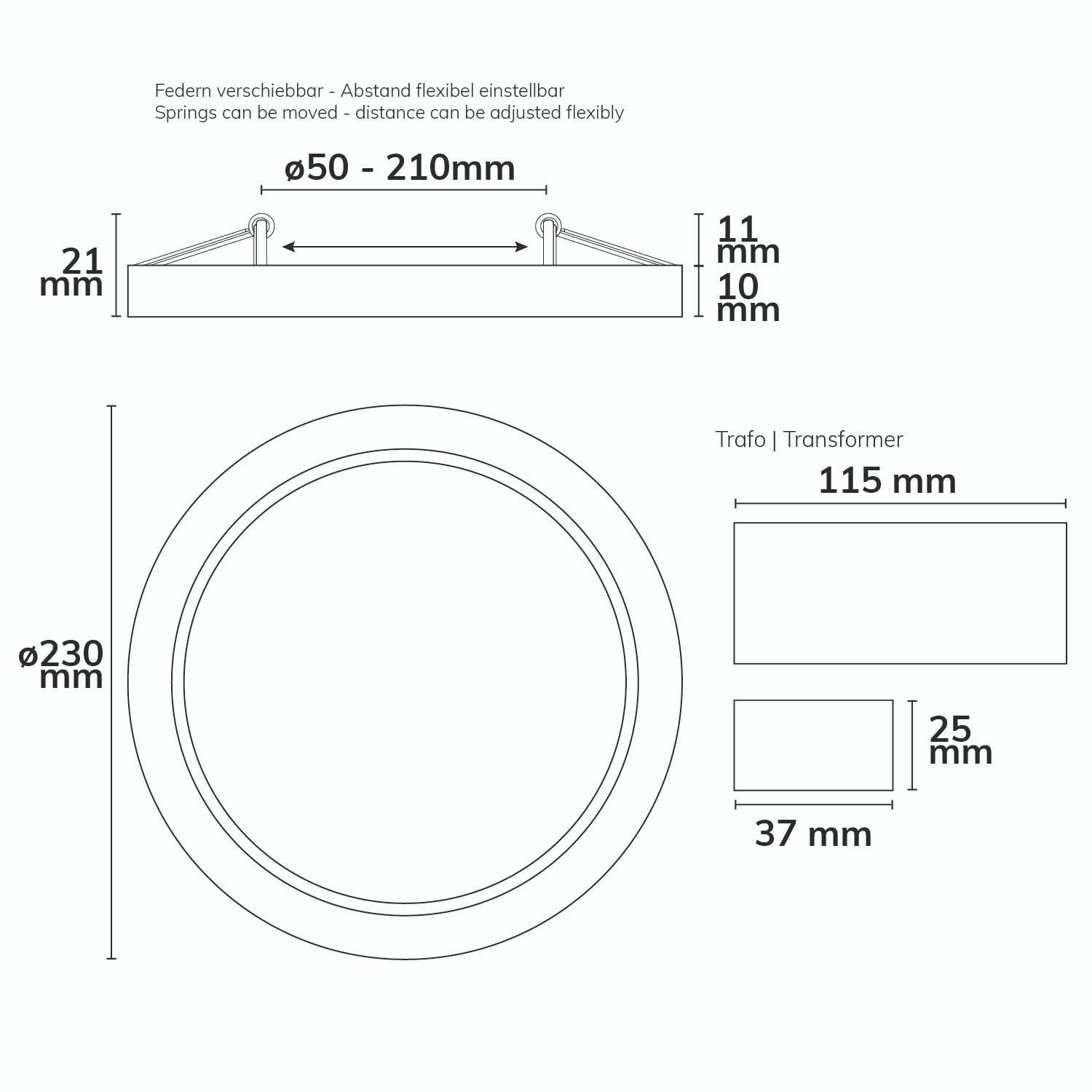 ultraflach, inkl. steckbarer externer 300mA Trafo (35,5x135x25), hält mittels verstellbaren Federklammern in einem variablen Lochausschnitt von mind. 50mm bis max. 210mm