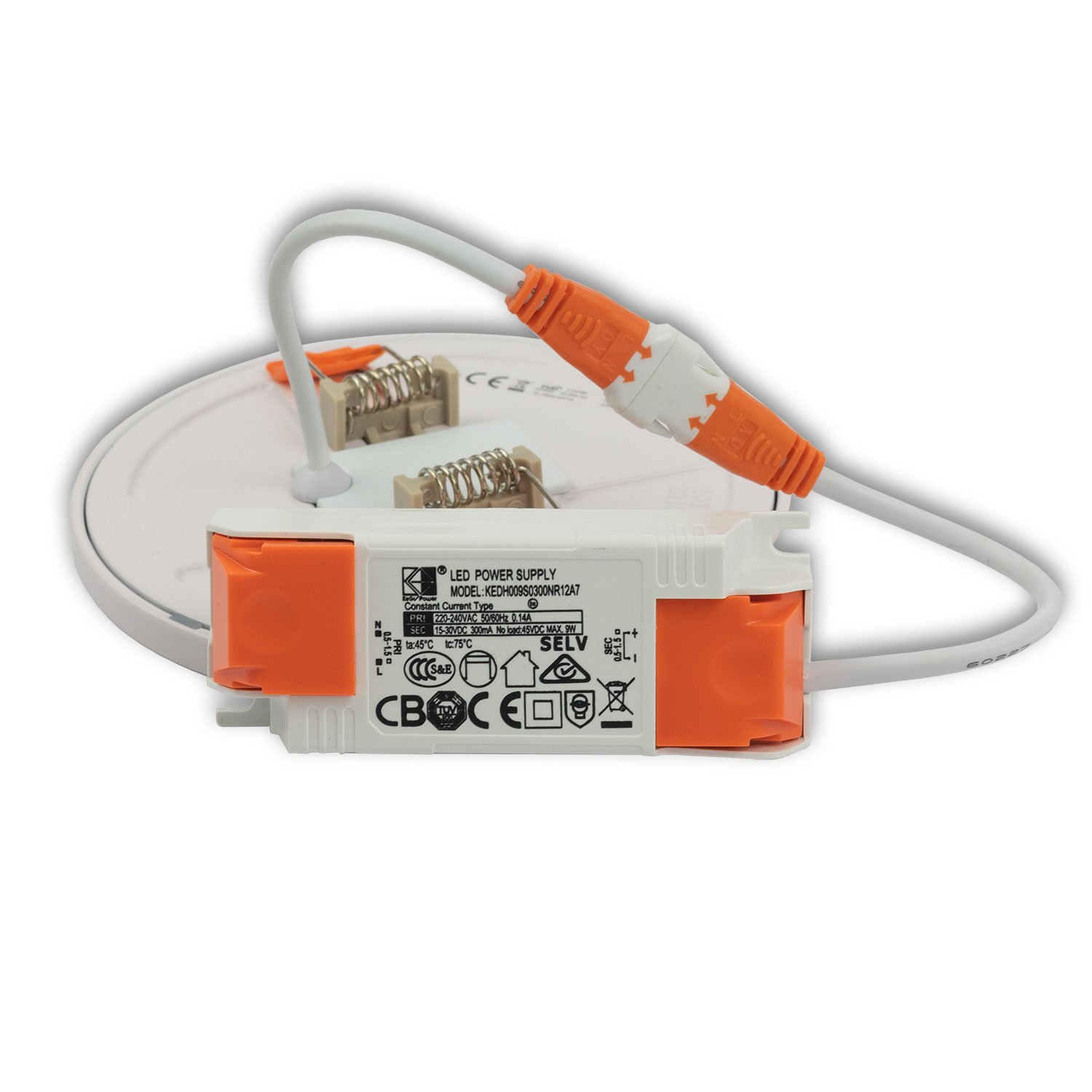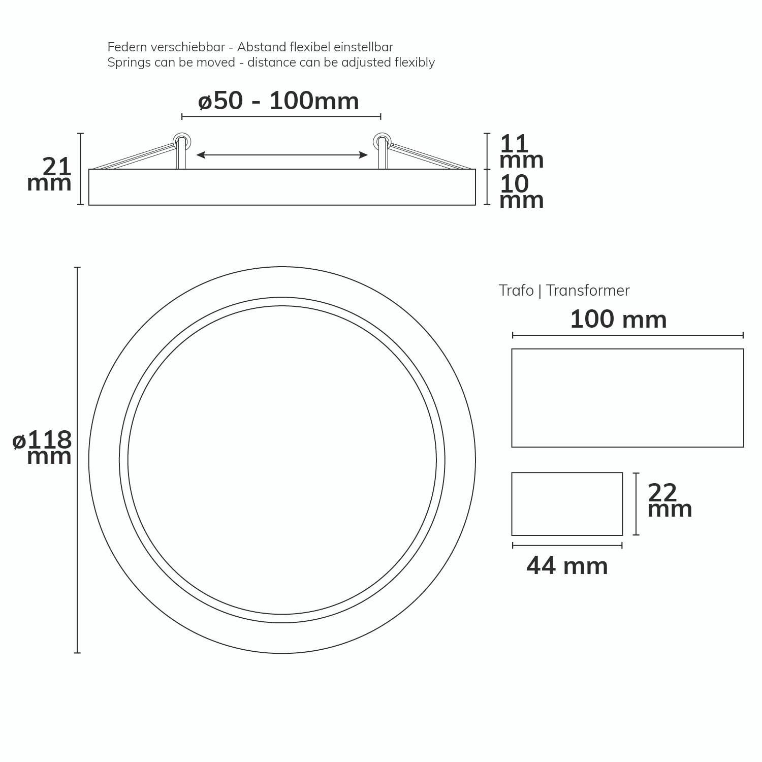 ultraflach, inkl. steckbarer externer 280mA Trafo, hält mittels verstellbaren Federklammern in einem variablen Lochausschnitt von mind. 50mm bis max. 100mm. Maße Trafo (LxBxH in mm): 100x44x22
