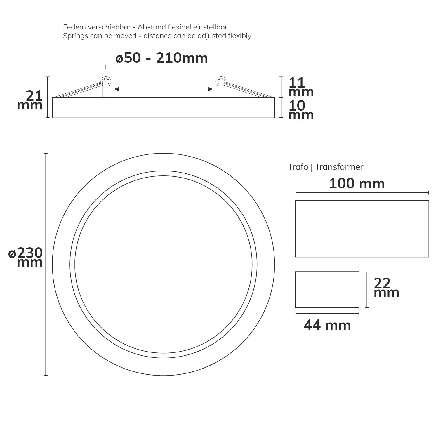 ultraflach, inkl. steckbarer externer 300mA Trafo, hält mittels verstellbaren Federklammern in einem variablen Lochausschnitt von mind. 50mm bis max. 210mm