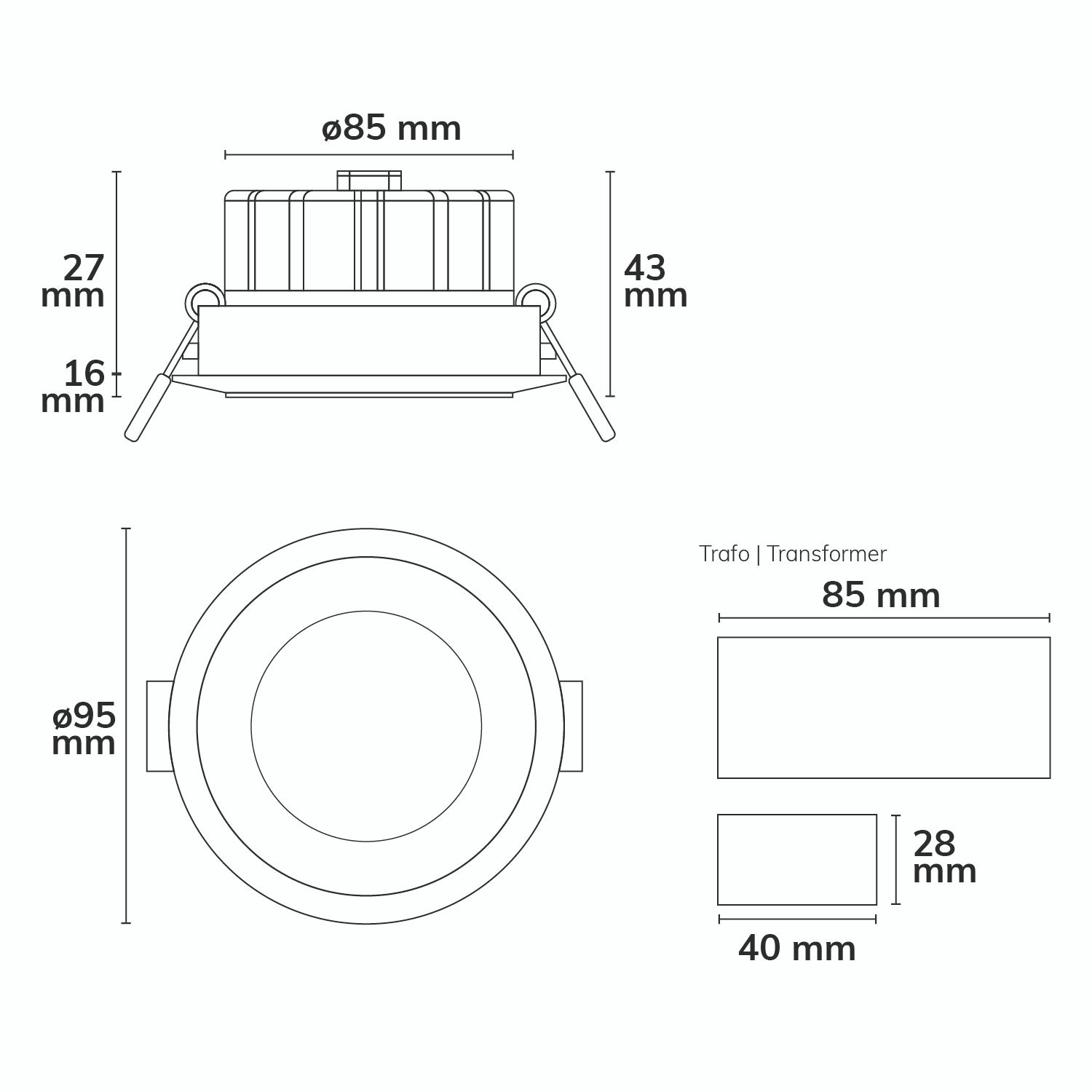 Dimmrange: 20-100% der Lichtleistung mit TRIAC Dimmer | Empfehlung: Phasenabschnitt-Dimmaktor verwenden | SUNSET Dimming 20%=2000K 40%=2300K 100%=2800K, Flickeranteil abhängig vom eingesetzten Dimm-Aktor und der Dimm-Art | Flickerfree im ungedimmten Zustand