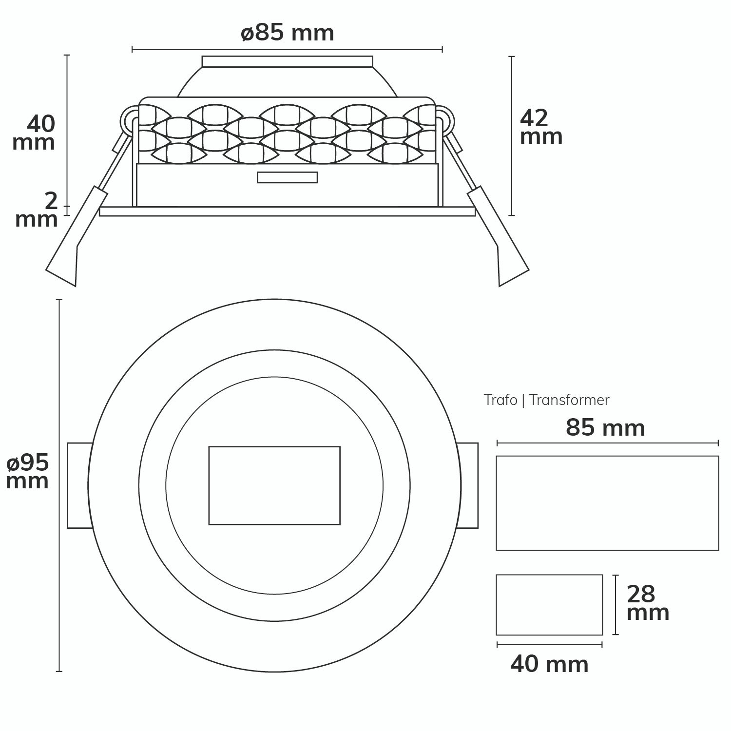 dimmbar mit Phasenabschnitt im Bereich von 30-100% der Lichtleistung