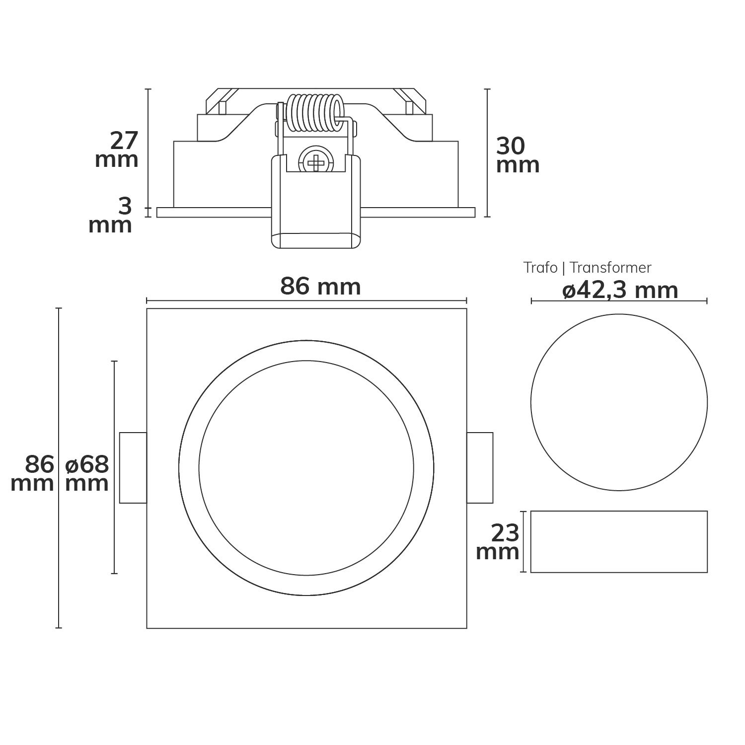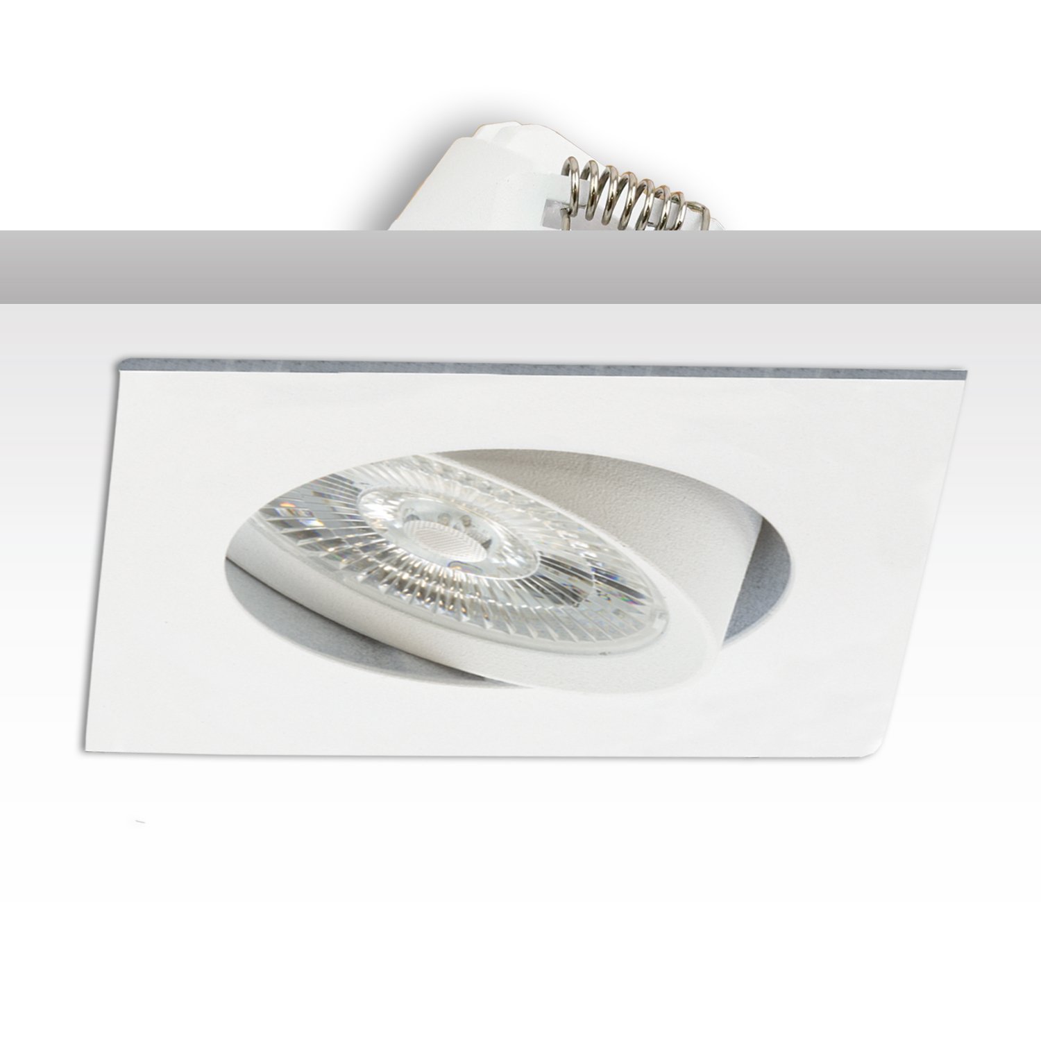Dieser LED Einbaustrahler ist ein schwenkbarer Strahler für den Innenbereich mit einem fixen Abstrahlwinkel von 45° und einer Einbautiefe von 27mm. Er verfügt über ein externes, steckbares Vorschaltgerät, welches die Stromversorgung regelt. Der Einbaustrahler ist dimmbar über Phasenan-/Abschnitt und besitzt eine Farbtemperatur von 1800 bis 2800 Kelvin sowie eine naturgetreue Farbwidergabe mit einem CRI von >93. Das Gehäuse ist aus Aluminium gefertigt und hat eine weiße Farbe. Der Einbaustrahler ist gegen Ei