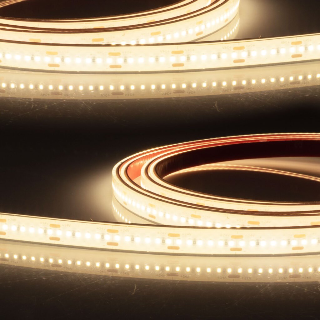 Dieser flexible Lichtstreifen eignet sich für den Einsatz sowohl im Innen- als auch im Außenbereich und verfügt über einen fixen Abstrahlwinkel von 100°. Er ist dimmbar via PWM und hat eine Farbtemperatur von 2700 Kelvin. Die Platinenoberfläche des Lichtstreifens ist weiß und besteht aus Kupfer/Silikon. Eine gute Farbwidergabe wird durch einen CRI-Wert von >90 gewährleistet. Der Lichtstreifen ist gegen das Eindringen von Insekten und Kondensfeuchte geschützt. Mit einer Nutzlebensdauer von 45000 Betriebsstun