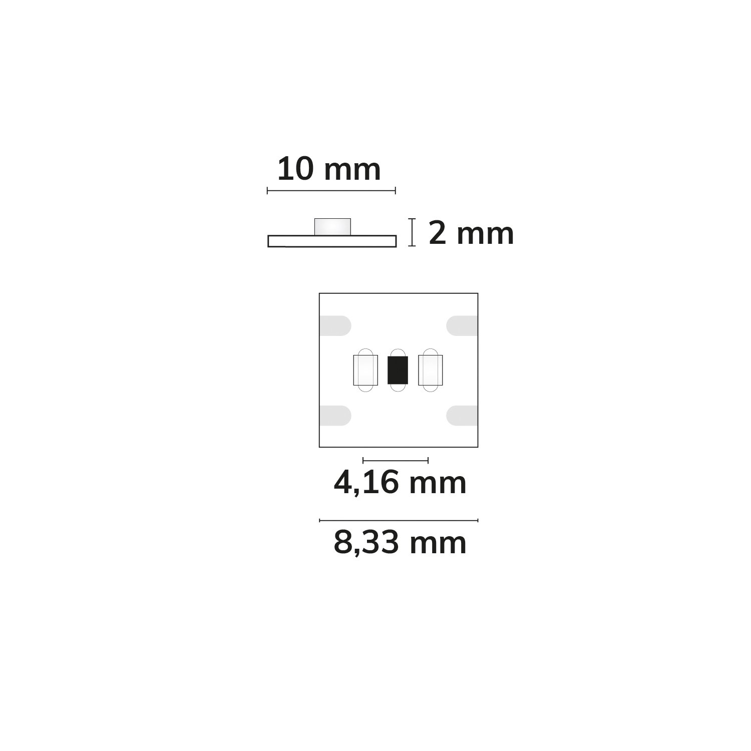 Trennstelle: 8,33mm mit je 2 SMD | Pitch (Lichtpunkt Mitte-Mitte): 4,17mm | 1 Einheit (Rolle) = 5m | max. Flexbandlänge pro Einspeisung: 10m | Längentoleranz + Wärmeausdehnung: 1% | erforderliche Kühlmasse min. 75 gr/m | inkl. 3M 300LSE Klebeband | Untergrund vor dem Ankleben reinigen und entfetten! Nicht wieder ablösen! | Es passen die Verbinder der Gruppe: K2-210 | BESONDERHEIT: Anschlusskabel beidseitig