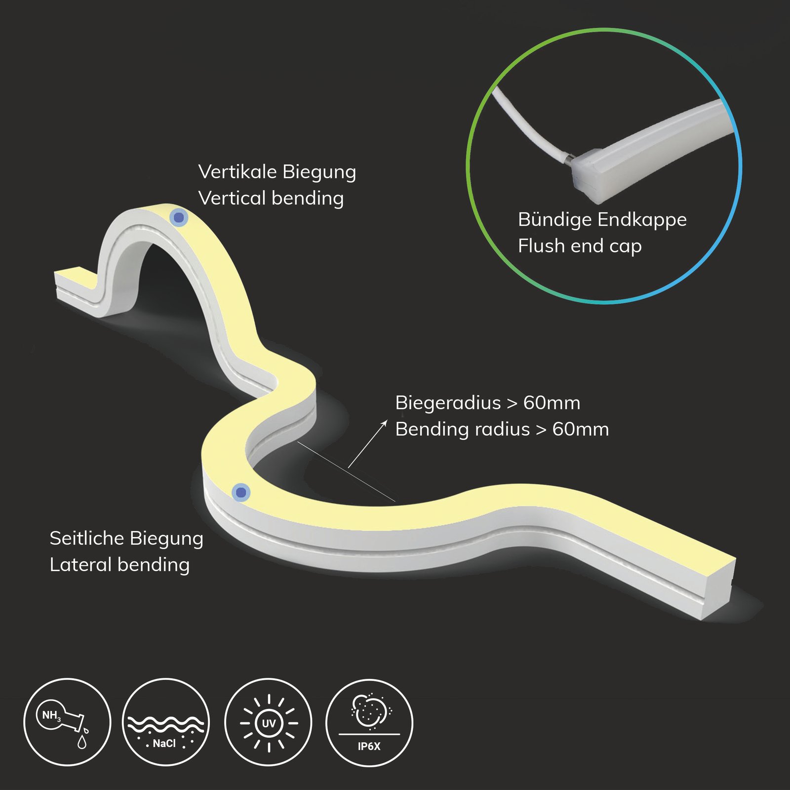 Trennstelle: 50mm mit je 7 SMD | Pitch (Lichtpunkt Mitte-Mitte): 7,14mm | max. Flexbandlänge pro Einspeisung: 5m | Längentoleranz + Wärmeausdehnung: 1% | kein Kühlprofil erforderlich | ohne Klebeband! | Silikon Verguss | BESONDERHEIT: 30cm 2-pol. Mantelleitung einseitig, weiß, Anschluß stirnseitig, offene Litze | HINWEIS: in der Breite und Höhe bündige Endkappen, vertikal und horizontal biegbar (Biegeradius min. 60mm) | Schwer entflammbar und flammwidrig (IEC 60695-11-5), IK08 (IEC 62262), salzsprühbeständig (IEC 60068-2-11:2021), UV-beständig (ASTM G154-2016)
